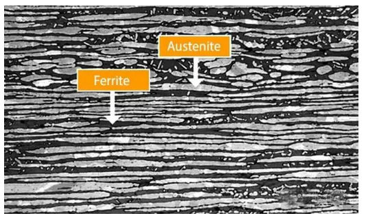 雙相不銹鋼(Duplex Stainless Steel,簡稱DSS),指鐵素體與奧氏體各約占50%,一般較少相的含量最少也需要達到30%的不銹鋼。在含C較低的情況下,Cr含量在18%~28%,Ni含量在3%~10%。有些鋼還含有Mo、Cu、Nb、Ti、N等合金元素。