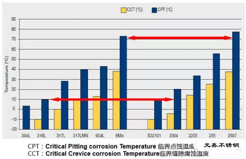 (2)除耐應力腐蝕性能外,其他耐局部腐蝕性能都優于鐵素體不銹鋼。