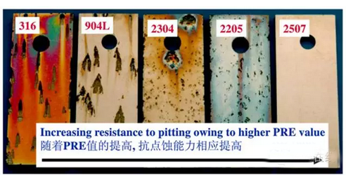 (3)在許多介質中應用最普遍的2205雙相不銹鋼的耐腐蝕性優于普通的316L奧氏體不銹鋼,而超級雙相不銹鋼具有極高的耐腐蝕性,在一些介質中,如醋酸,甲酸等甚至可以取代高合金奧氏體不銹鋼,乃至耐蝕合金。