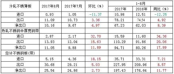 2017年8月份我國不銹鋼板(帶)凈出口環(huán)比增長2.73%