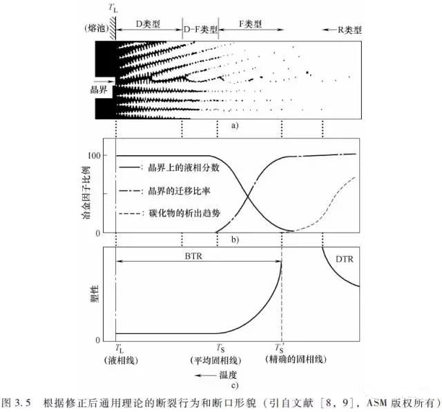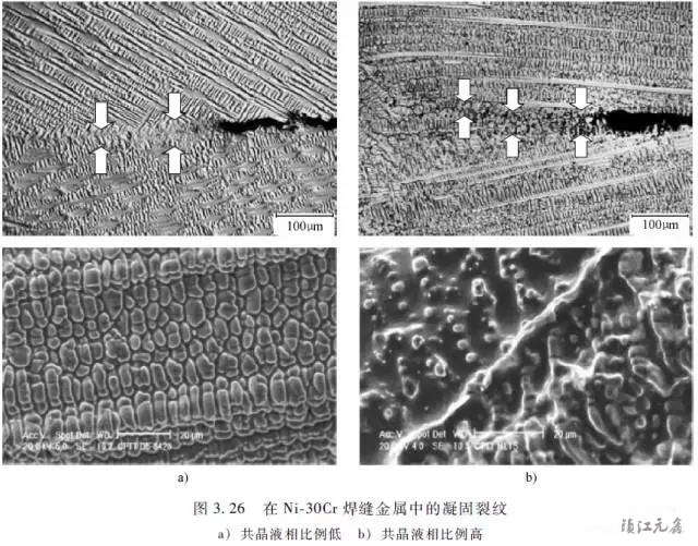 圖30.26a所示的一組照片中,顯示的是在凝固末端,焊縫金屬具有相對較低(<5%)的共晶液相,對應(yīng)的斷口表面表現(xiàn)出很明顯的樹枝晶特征。圖3.26b所示的一組照片中,顯示的是在凝固末端,焊縫金屬形成了大約10%的共晶液相,這么高的液相比例分數(shù),由于回填作用,導致斷口表面被這些液相所覆蓋,隱約可以看到一些樹枝晶特性。