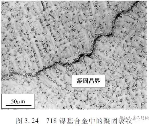 通常情況下,以奧氏體(面心立方)為初生相凝固的材料比以鐵素體(體心立方)為初生相凝固的材料對凝固裂紋更為敏感。屬于這種規(guī)律的材料中,包括大多數(shù)的奧氏體不銹鋼、部分結(jié)構(gòu)鋼以及全部的鎳基合金。圖3.24所示的例子是一個718鎳基高溫合金,718合金(Ni-20Cr-15Fe-5Nb-3Mo)是通過添加Nb來實現(xiàn)析出強化。大多數(shù)鎳基合金中的Nb偏析會產(chǎn)生一個共晶反應(yīng),導致最終的凝固組織是由NbC、富Nb的Laves相或者是由這些相的混合物所組成的。Nb偏析產(chǎn)生的凈效應(yīng)是擴大了凝固溫度范圍,并且提高了裂紋敏感性。沿著凝固晶界的連續(xù)液態(tài)薄膜的痕跡非常明顯,如圖3.24所示,其中含有NbC,并且有可能存在Laves相。