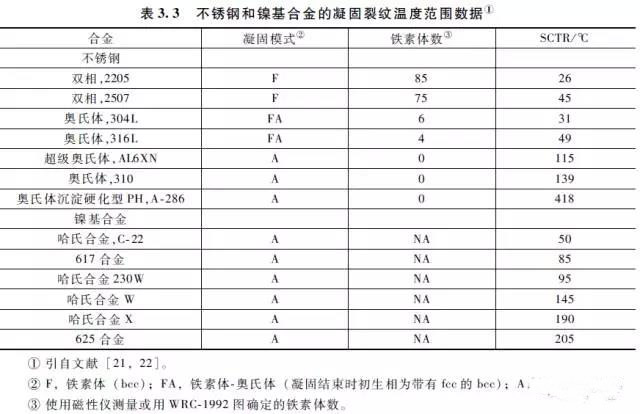 如表3.3中所列,625鎳基填充金屬的凝固裂紋溫度范圍是205℃這個數(shù)量級。這表明,該合金對凝固裂紋具有相對高的敏感性?墒牵625鎳基填充金屬具有良好的凝固裂紋抗力而經(jīng)常被選用,這似乎是和其高的凝固裂紋溫度范圍相矛盾。這種矛盾的確和確定SCTR的方式有關(guān),即使用橫向可變拘束試驗時,施加的應(yīng)變量相對較高。這種高的應(yīng)變迫使凝固裂紋沿著整個凝固范圍擴展。在較低應(yīng)變下,出現(xiàn)的共晶液相可實現(xiàn)裂紋的愈合,這樣,625鎳基填充金屬就具有一定的抗凝固裂紋的能力。實際應(yīng)用中,當焊縫拘束度水平高,或在不良的焊道形狀條件下(即大的深/寬比,或呈下凹的焊道形狀),均發(fā)現(xiàn)這種填充金屬對凝固裂紋敏感。