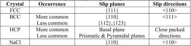事實證明,原子****密排面是最廣泛的間距平面,而密排方向擁有最小移動距離。滑移面和滑移方向可以組合成一個滑移系。常見的滑移系由表1給出。