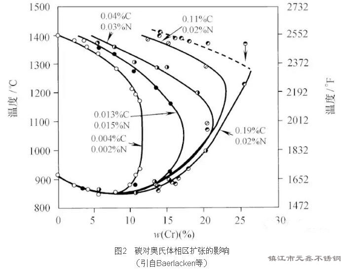 元素,它使γ相回線區擴大,即在鉻含量高得多的成分下仍使奧氏體在高溫區保持穩定。圖2示出了碳對擴大奧氏體相區的影響,請注意即使很少的碳含量,也可使γ相回線區顯著地擴大,這對于開發馬氏體鋼很重要,因為要在冷卻時形成馬氏體,則在高溫時鋼必須是奧氏體。而對于鐵素體類鋼,γ相回線面積必須予以控制,使得高溫時沒有或者只有很少奧氏體存在。