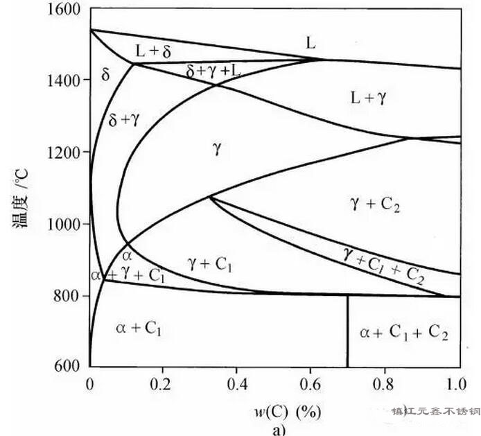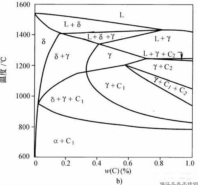 把碳加入鐵-鉻系,顯著改變了平衡相圖使其復雜化。由于碳是奧氏體形成