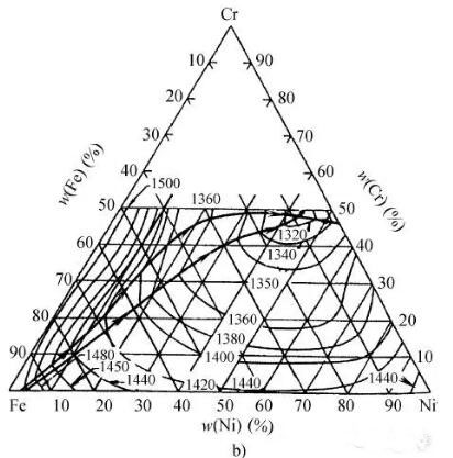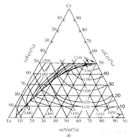液相面在圖4a上顯示了一條從相圖三角形靠近富Fe角的點出發到Cr-Ni邊的粗黑曲線。這條曲線把凝固成鐵素體初始析出相的成分和凝固成奧氏體初始析出相的成分區分開來。在接近48Cr-44Ni-8Fe的成分點形成了一個三元共晶點。