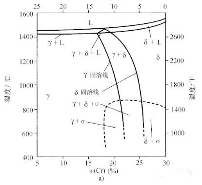 因為鉻是不銹鋼的主要合金元素,所以把圖1所示的鐵-鉻系相圖作為討論不銹鋼相平衡的起點。注意相圖中Cr在高溫時全部溶于鐵中,所有Fe-Cr合金凝固時都生成鐵素體。而凝固溫度區間很窄。對低鉻含量的合金在912~1394℃ 溫度區間形成一個奧氏體區,通常被稱為γ相回線。鉻的質量分數高于12.7%的合金在高溫時全是鐵素體,而鉻的質量分數低于12.7%的合金在這個γ相回線溫度范圍內多多少少要形成一些奧氏體。而鉻的質量分數低于12%的合金在此回線的溫度范圍內將是全奧氏體組織,形成的奧氏體在快速冷卻時可轉變成馬氏體。在Fe-Cr系中存在一種稱為σ相的低溫平衡相,這種相是具有(Fe,Cr)化