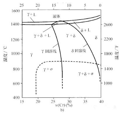 Fe-Cr-C和Fe-Cr-C三元系相圖。把這些相圖用于各種類型的不銹鋼可以預測微觀組織的演變。然而這些相圖只能近似地預測焊縫中形成的實際微觀組織,這是因為:①不銹鋼母材和填充金屬含有高達十種合金元素,標準的相圖很難與其相匹配;②相圖是基于平衡條件繪制的,而焊接時快速加熱和冷卻形成了明顯的非平衡條件。