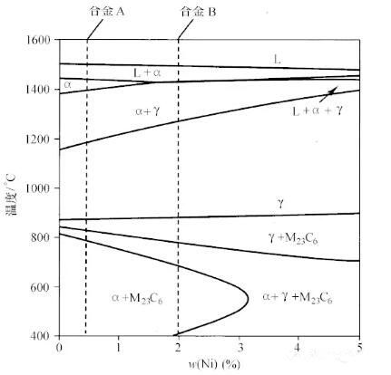 個圖的成分軸上Ni的質量分數由0%變化到5%。在確定Ni含量如何影響各個相區,特別是對確定Ni加入量如何影響這種合金的焊縫及熱影響區中鐵素體含量方面這種相圖是很有用的。例如在圖6中比較w(Ni)=0.3%的合金A和w(Ni)=2.0%的合金B,可以發現對于合金B在1400℃附近不存在鐵素體單相區,而隨Ni含量增加α+γ雙相區的溫度范圍變得越來越窄。這些數據也可以用來建立圖7所示的以摩爾分數表示的相組分隨溫度的變化圖。用這樣的方法可以方便地評價母材和填充金屬成分對相穩定性的作用,并可預測焊接和熱處理過程中微觀組織的演變。