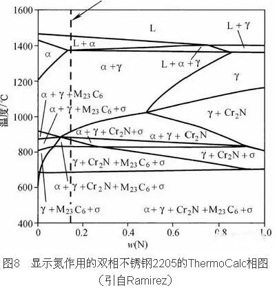 圖8給出了另外一個例子,這是以氮作為成分變量由計算得到的雙相不銹鋼2205的相圖。一個典型的氮的質量分數是0.15%,圖上以一根垂直虛線表示。由圖可知即使在高溫,合金也不能得到全鐵素體組織,而微觀組織中總有一些奧氏體存在,這就可以有效地減少在焊接熱影響區鐵素體的長大。圖中也示出