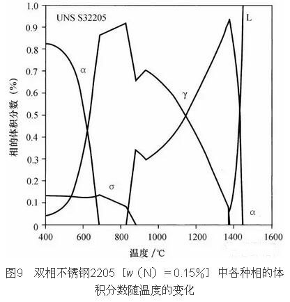 請注意圖9指出:在低于大約900℃ 的溫度時,σ相是一種平衡相。盡管在鐵-鉻系合金中σ相形成得很緩慢,但在Fe-Cr-Ni系含鐵素體的不銹鋼中,特別是在Cr、Mo含量較高、在大約700℃時σ相的形成要快得多。雙相鋼的這種特性加上鐵素體含量又高,使其對形成σ相而產生的脆化很敏感。為了避免由鐵素體形成σ相,要求在大致為900~500℃ 的溫度范圍內快速冷卻。雙相鋼的這種特性也使其高溫加工包括焊后熱處理受到限制。