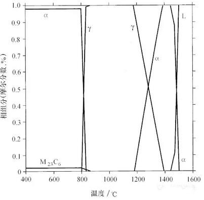 (質量分數) 為12Cr=0.5MO-0.5Si-0.1C的典型410型馬氏體不銹鋼的相圖。這