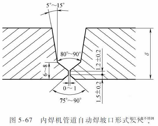管道內(nèi)自動焊需要專用的坡口形式,坡口形式及尺寸如圖5-67所示。坡口的質(zhì)量直接決定著焊縫的質(zhì)量,坡口整形機的性能和操作者的水平?jīng)Q定著坡口的質(zhì)量,所以應(yīng)選擇性能良好、加工效率高的坡口整形機。由于常用工具較難精確地測量復合坡口的尺寸和誤差,所以應(yīng)根據(jù)焊接工藝評定和相關(guān)標準做出專用的測量工具,對加工的每個坡口進行測量,每個坡口的測量點數(shù)應(yīng)不少于4點,且4點應(yīng)均布在整個圓周上。對管口平面與管軸線的垂直度也應(yīng)進行測量,每10個坡口至少測量一個,測量點數(shù)同樣不應(yīng)少于4點,且4點應(yīng)均布在整個圓周上。如果發(fā)現(xiàn)坡口尺寸和垂直度有超標現(xiàn)象,必須對坡口整形機進行調(diào)整,并對不合格的坡口重新進行加工。由于采用自動化焊接,坡口尺寸必須控制在焊接工藝評定和標準要求的范圍內(nèi),且應(yīng)力求達到坡口尺寸的一致性。