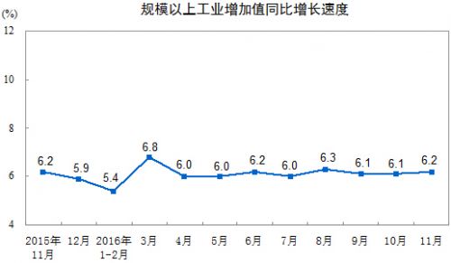 2016年11月份,規模以上工業增加值同比實際增長6.2%(下同,增加值增速均為扣除價格因素的實際增長率),較10月份加快0.1個百分點。從環比看,11月份,規模以上工業增加值比上月增長0.51%。1-11月份,規模以上工業增加值同比增長6.0%。