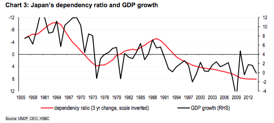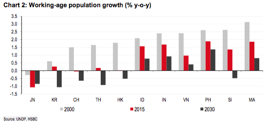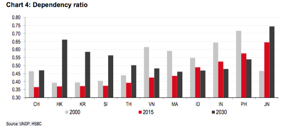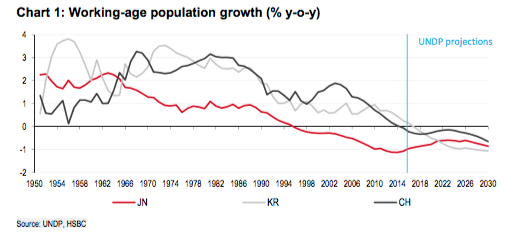 據匯豐銀行的報告稱,亞洲人口增速急劇下降。日本老齡化人口正以前所未有的速度增長,而亞洲其他經濟體也面臨著同樣的問題。中國和韓國將很快重蹈日本的道路,兩國的勞動年齡人口已開始減少。