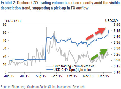 高盛表示,自11月30日國際貨幣基金組織(IMF)宣布將人民幣納入SDR后,監(jiān)管層開始更加接受人民幣的貶值。盡管最近歐央行不夠鴿派的利率決議導(dǎo)致美元下跌,這在一定程度上緩解了人民幣的拋壓。但是最近在岸人民幣成交量上升,以及離岸-在岸價(jià)差擴(kuò)大,顯示資本外流情況可能加劇。