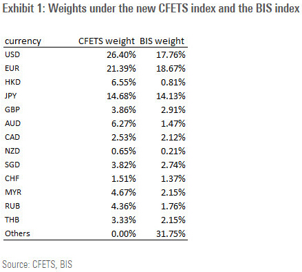 高盛提示到,CFETS指數(shù)由13種貨幣按對中國的貿(mào)易重要性加權(quán)構(gòu)成,其中剔除了再出口的影響。該指數(shù)中,美元和歐元的權(quán)重要顯著高于國際清算銀行(BIS)的中國有效匯率。美元、歐元、日元、英鎊和港元五種主要貨幣權(quán)重在CFETS指數(shù)中占到73%,對應(yīng)BIS的指數(shù)中只占到54%。
